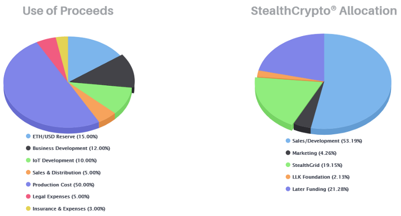 Cadangan ETH / USD – (15,00%) dengan Pengembangan Bisnis yang ditargetkan pada (12,00%). Pengembangan IoT difokuskan pada (10,00%), sementara Penjualan & Distribusi StealthCrypto bernilai – (5,00%), Biaya Produksi ditetapkan sebesar (50,00%), melalui nilai Beban Hukumnya sebesar (5,00%), dan Asuransi kumulatif & Beban senilai (3,00%). Ini dinilai pada nilai persentase dari proses berbagi umumnya oleh tim.